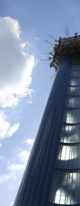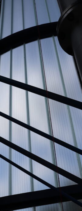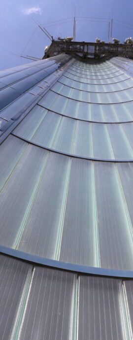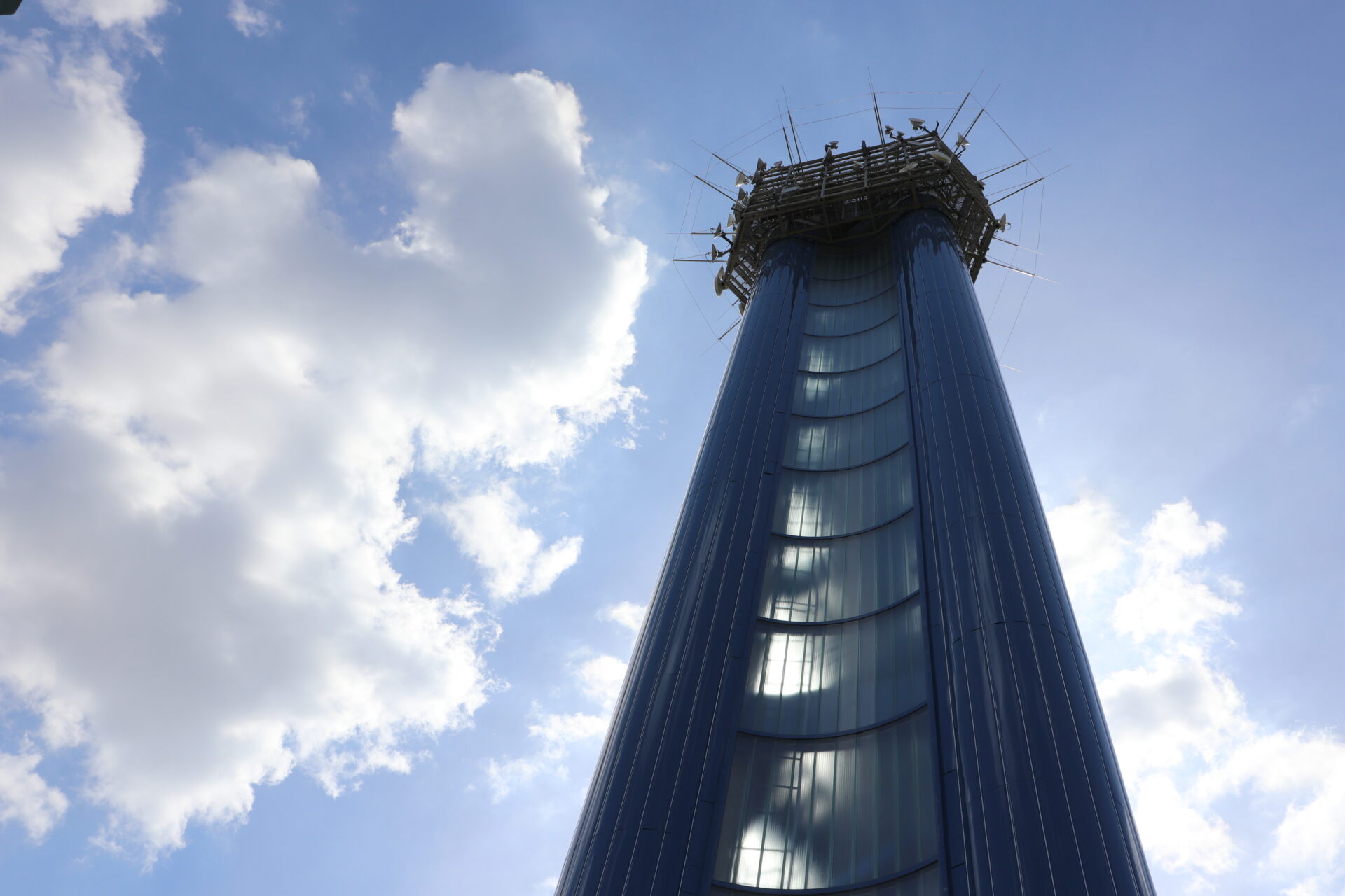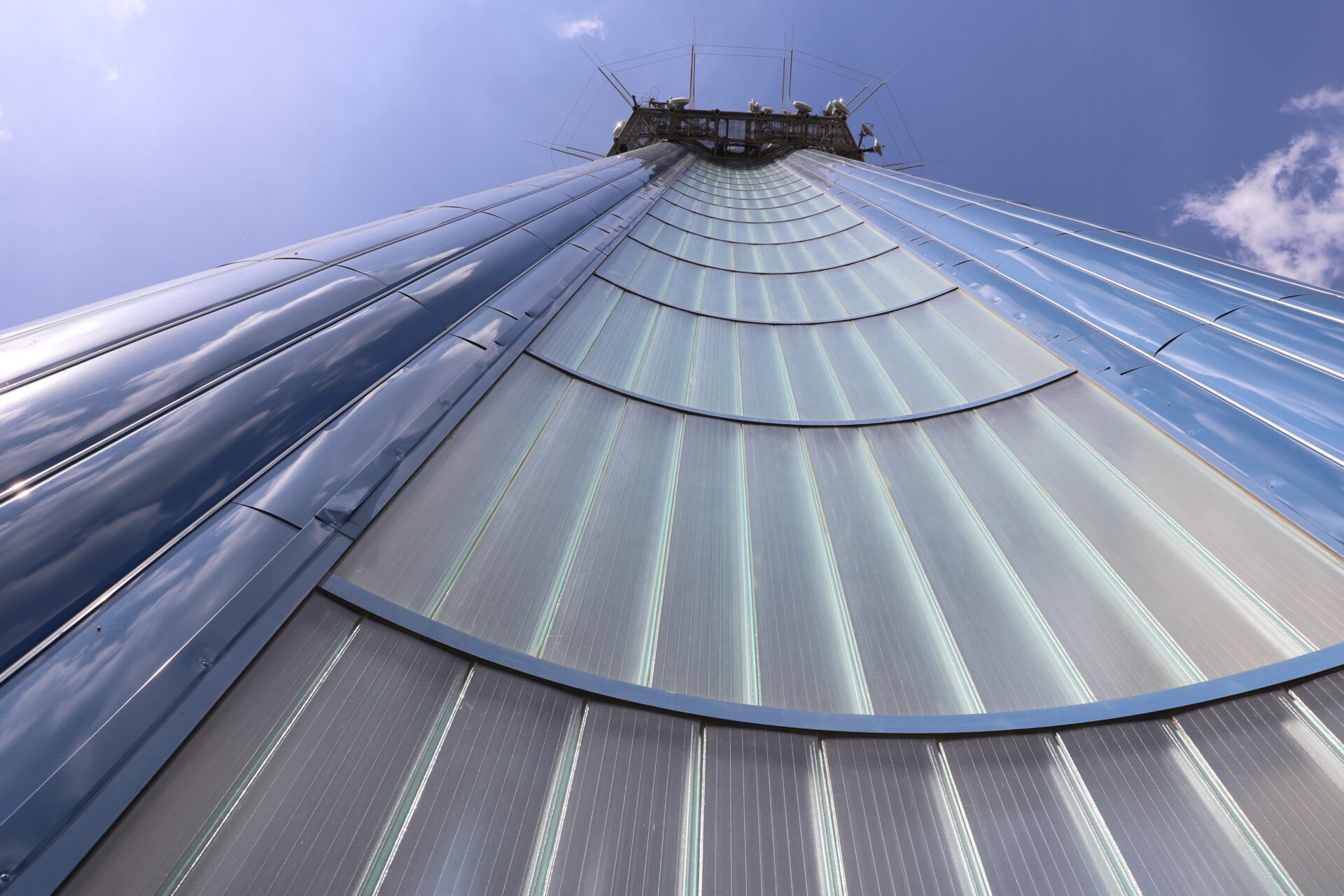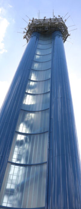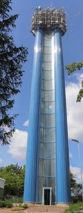 Vlastní vodárenská věž je tvořena třemi 50 m vysokými, a vzájemně do trojúhelníku spojenými ocelovými válci (tubus 1,8 m). Mezi jednotlivými tubusy jsou prohnuté stěny z profilového skla, které chrání vnitřní schodiště vedoucí až na vrcholek věže.