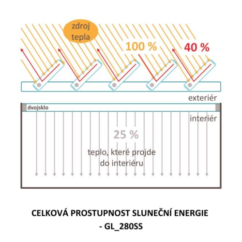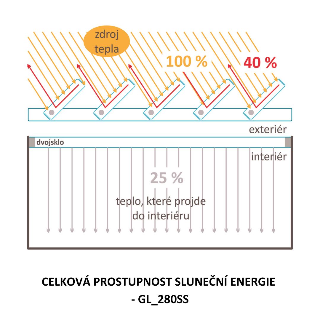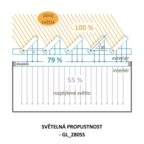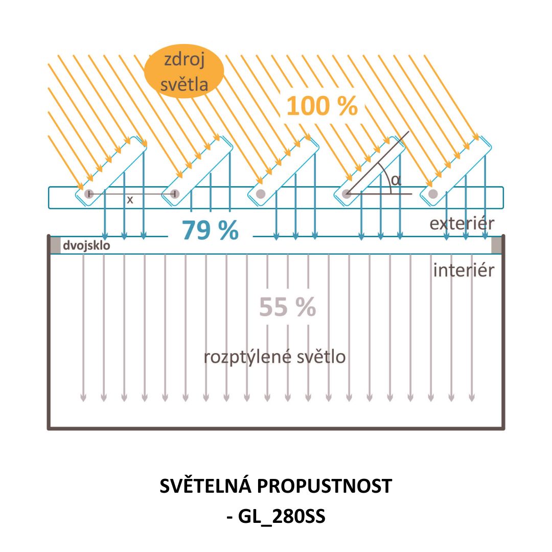 Vertikální skleněné lamely GL_280SS nabízejí oproti horizontálním stínícím systémům výraznou výhodu “ideálního stínění“. Vertikální skleněné lamely v každém ročním období nabízejí stálý odklon slunečních paprsků nezávisle na denní dráze slunce. Jemná struktura povrchu skleněných lamel část solární energie pohltí a část odrazí. Světelné paprsky však skleněnými lamelami prostoupí a intenzita světla v interiéru tak není snížena.