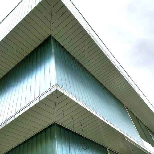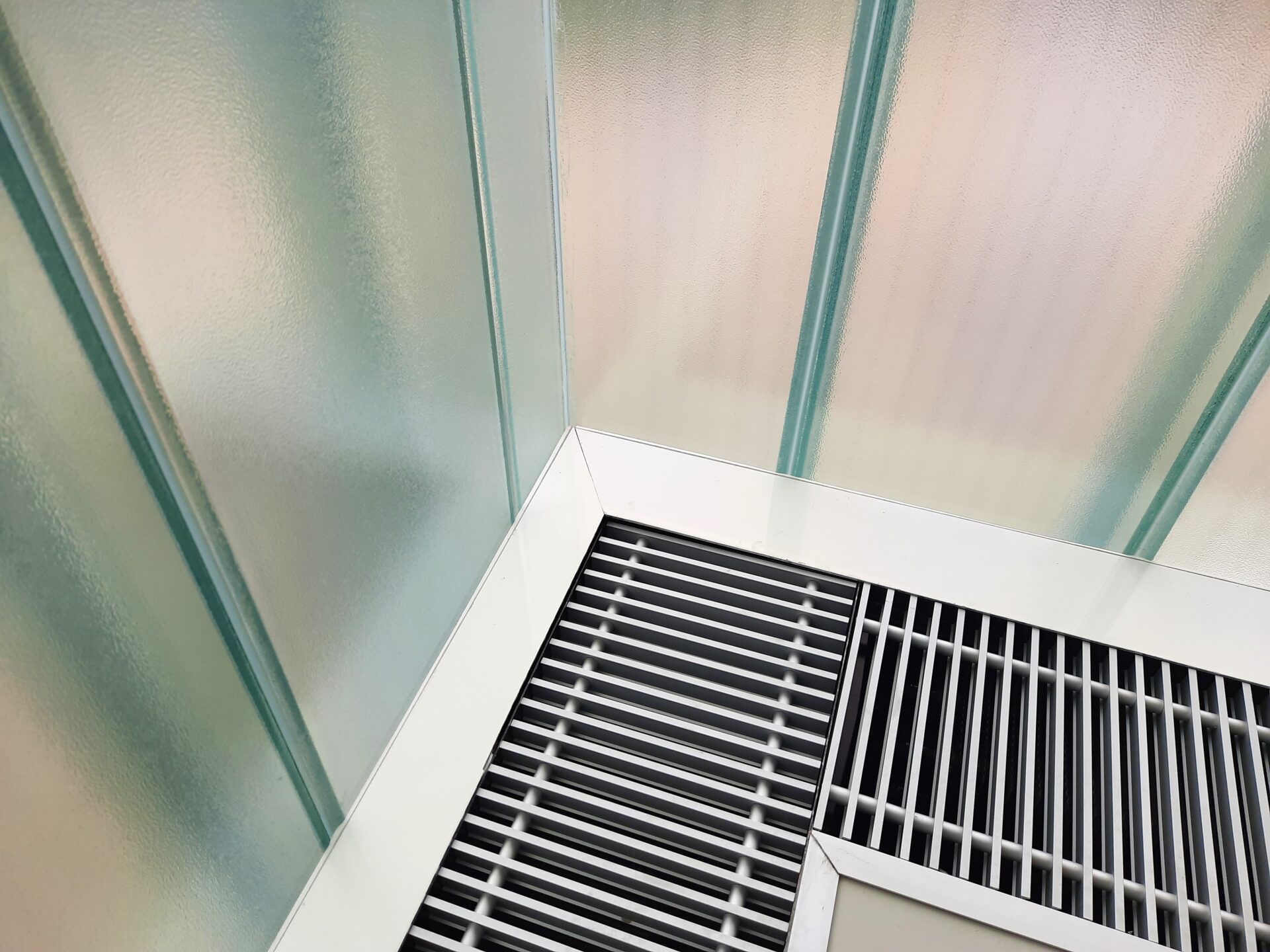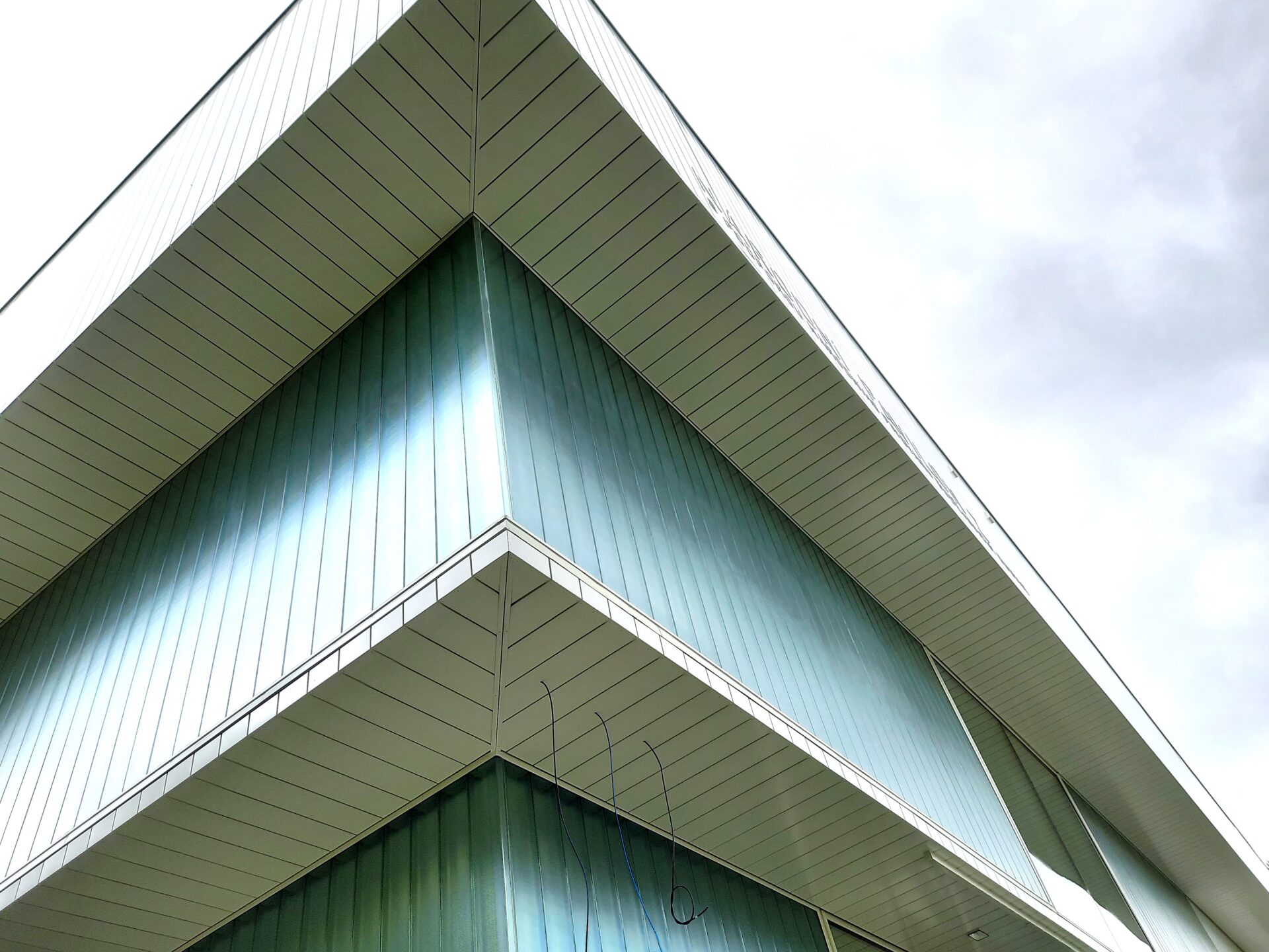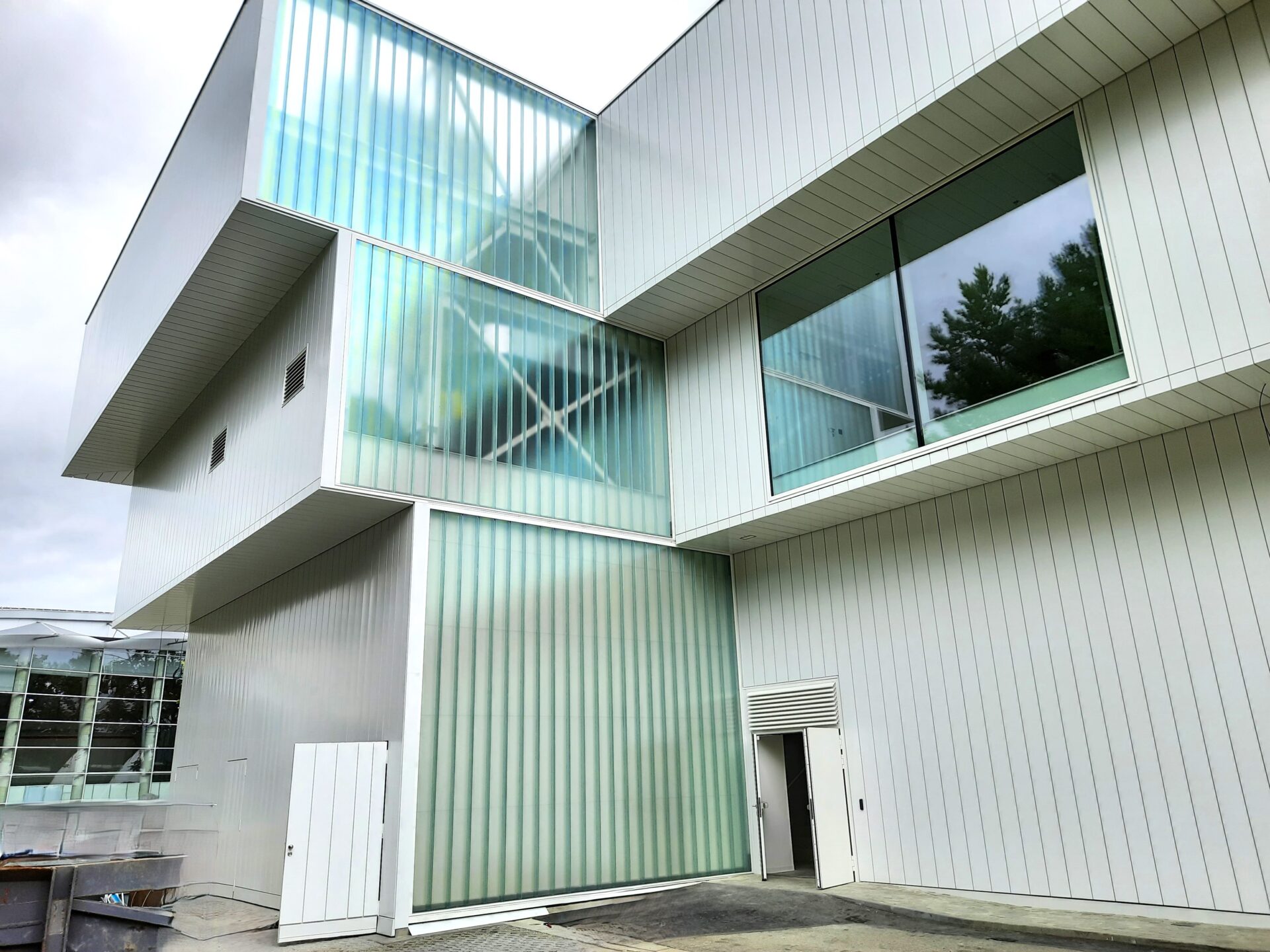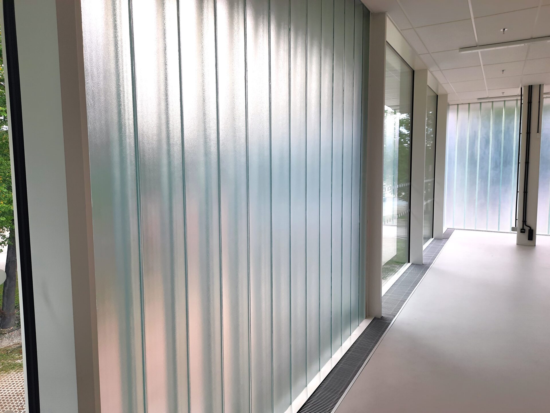 Minimalistická barevnost celého objektu umožnila architektům použít k prosklení netradiční profilové sklo v přírodní zelenkavé barvě. Skleněné stěny vytváří v interiéru až snový efekt. Do vnitřního prostoru pavilonu tak dopadá měkké světlo navozující příjemný dojem a intimní scénu. I v exteriéru vytváří stěny z profilového skla příjemné barevné efekty a celkově podtrhují vzdušný a minimalistický vzhled budovy.