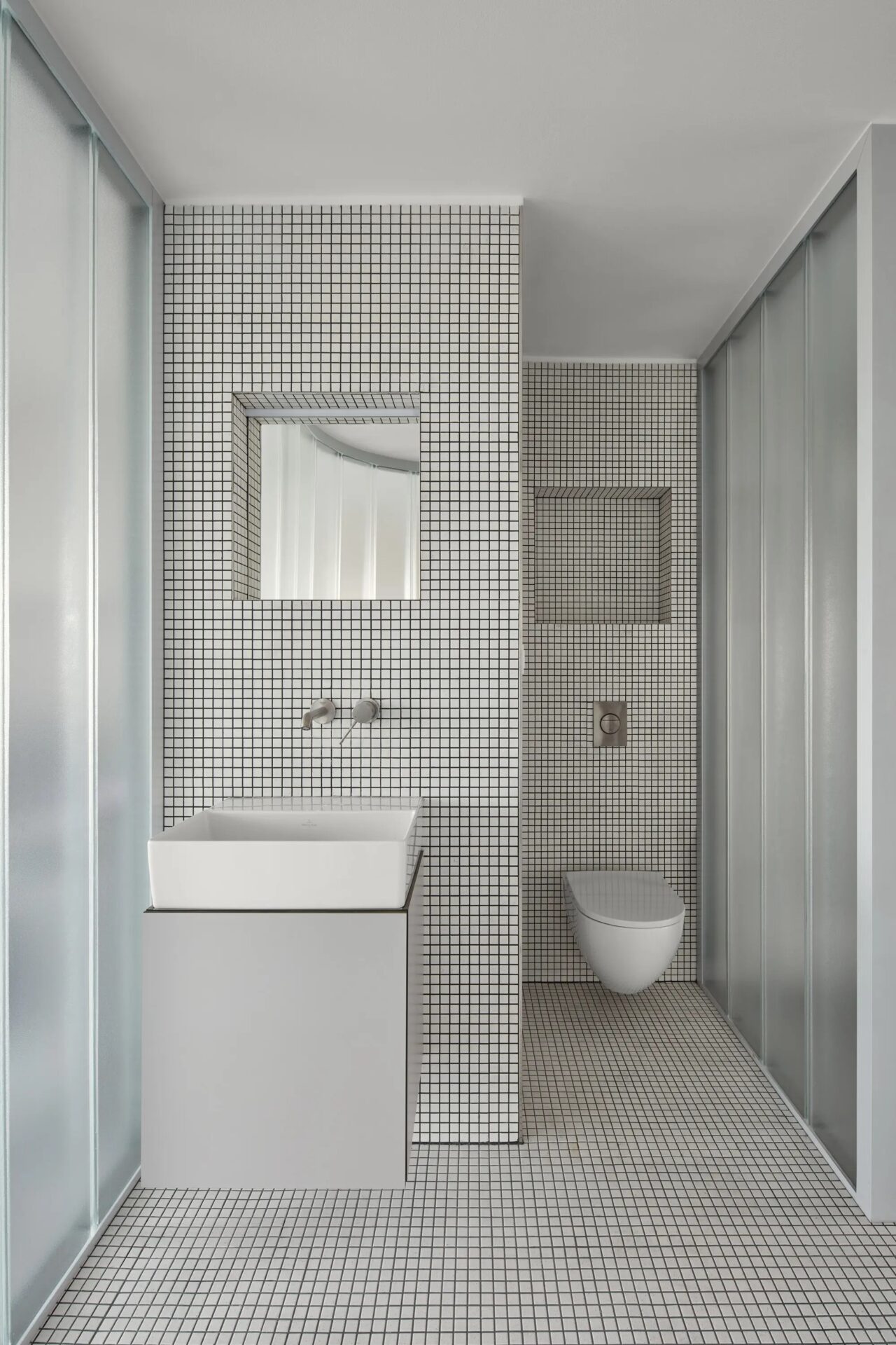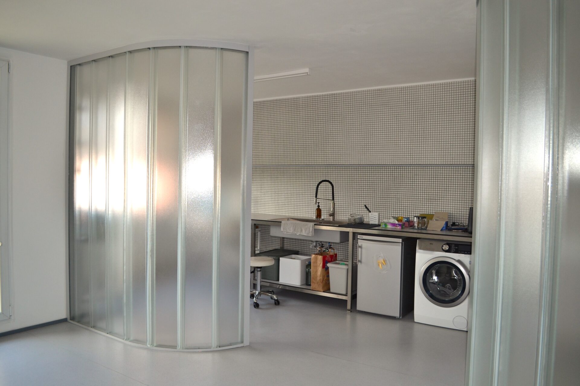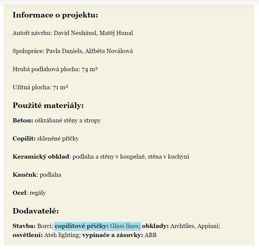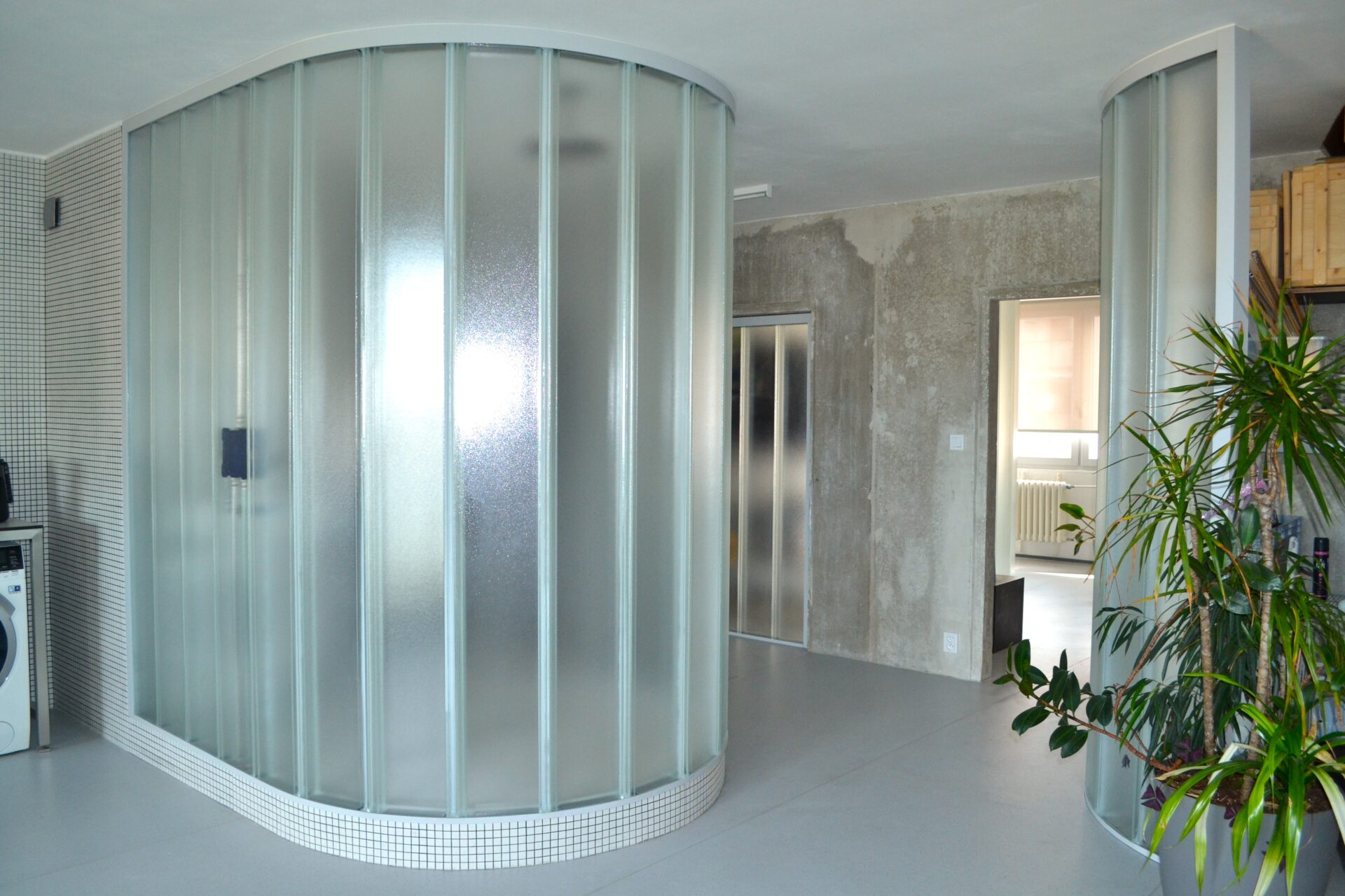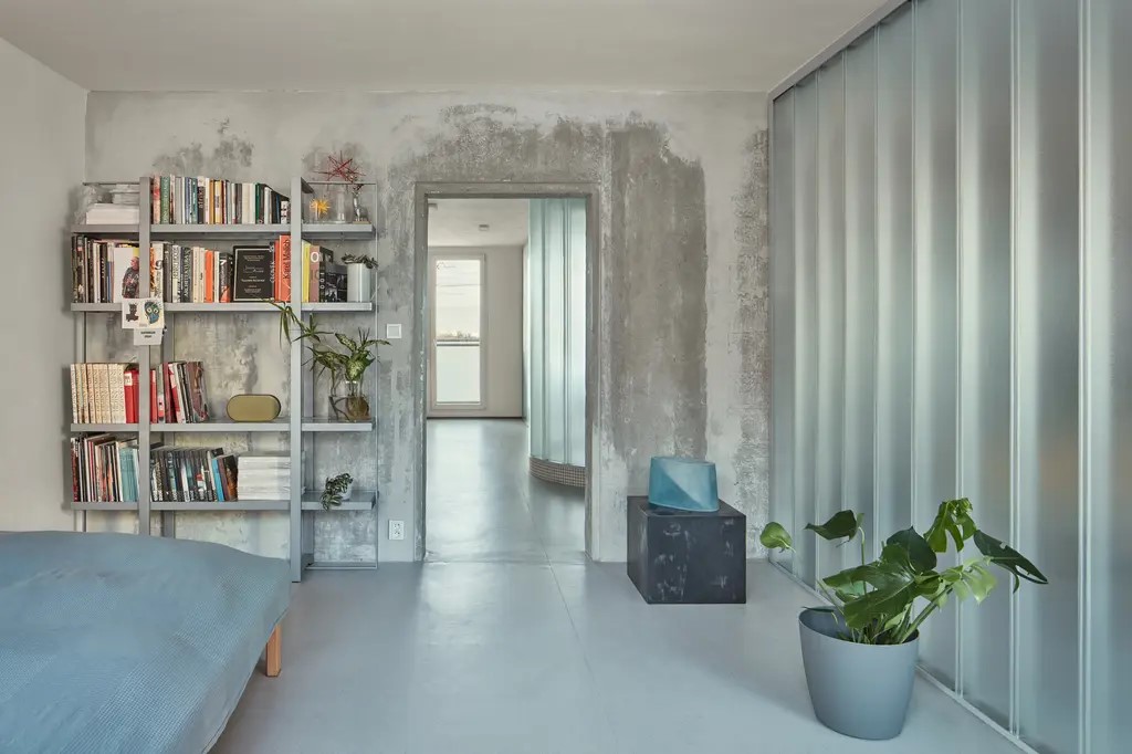 Díky volbě materiálů rozmlžili architekti v panelákovém bytě hranice i funkci jednotlivých prostorů a vytvořili tak maximálně otevřený a plynoucí interiér bez dveří členěný pouze obloukovými polopříčkami z copilitu. Tyto průsvitné skleněné tvárnice zajišťují průchod světla napříč bytem. Jejich materialita a charakter samozřejmě odkazují k celoživotní práci majitele bytu.