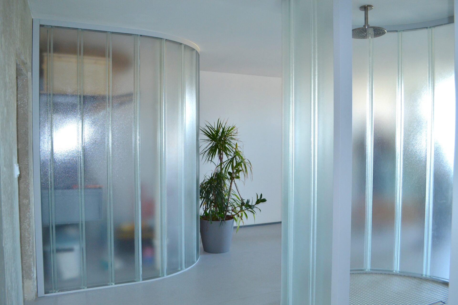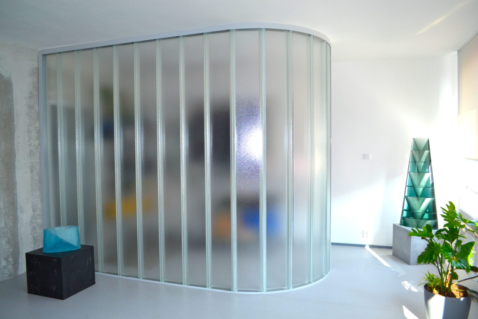 Krásná ukázka, že profilové sklo nemusí patřit jen do exteriérů a na fasády firemních objektů, ale může být originálním designovým prvkem třeba i v interiéru soukromého bytu.