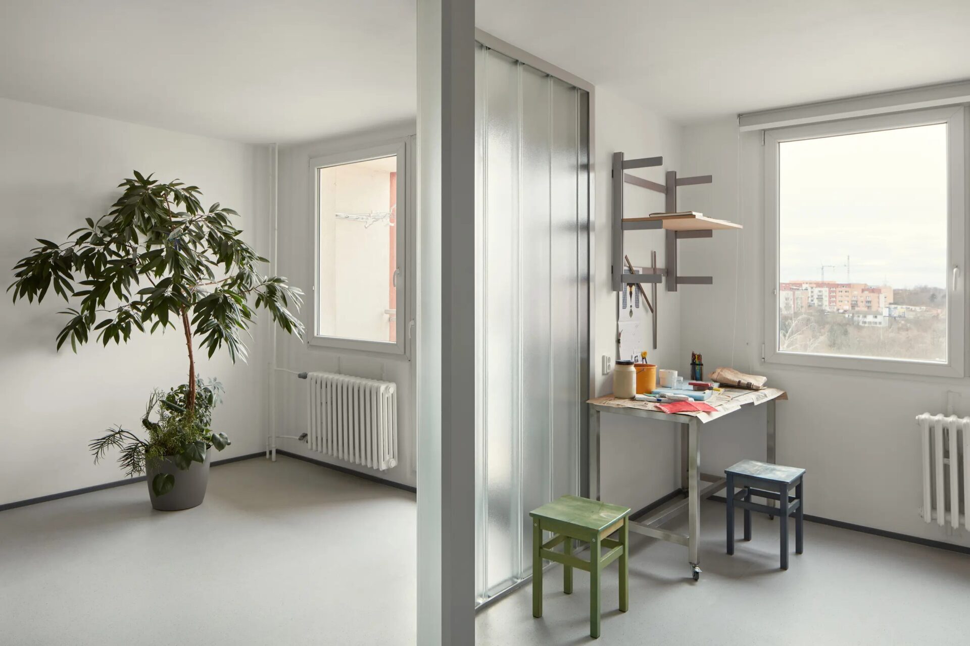 Rekonstrukce klasického panelákového bytu, jehož majitelem je sochař a sklář Vladimír Bachorík. Architekti v něm nechali zcela rozplynout hranice. Byt je zčásti obytným prostorem a z velké části sklářským ateliérem. Jednotlivé zóny a funkce se v něm přitom slučují a rozplývají.